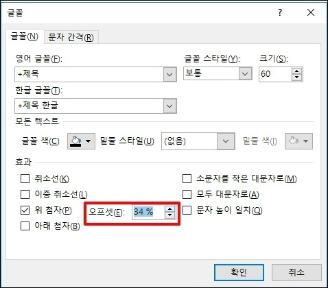 글꼴 창이 나타나면 오프셋 값을 수정하여 간격을 조정할 수 있습니다.
