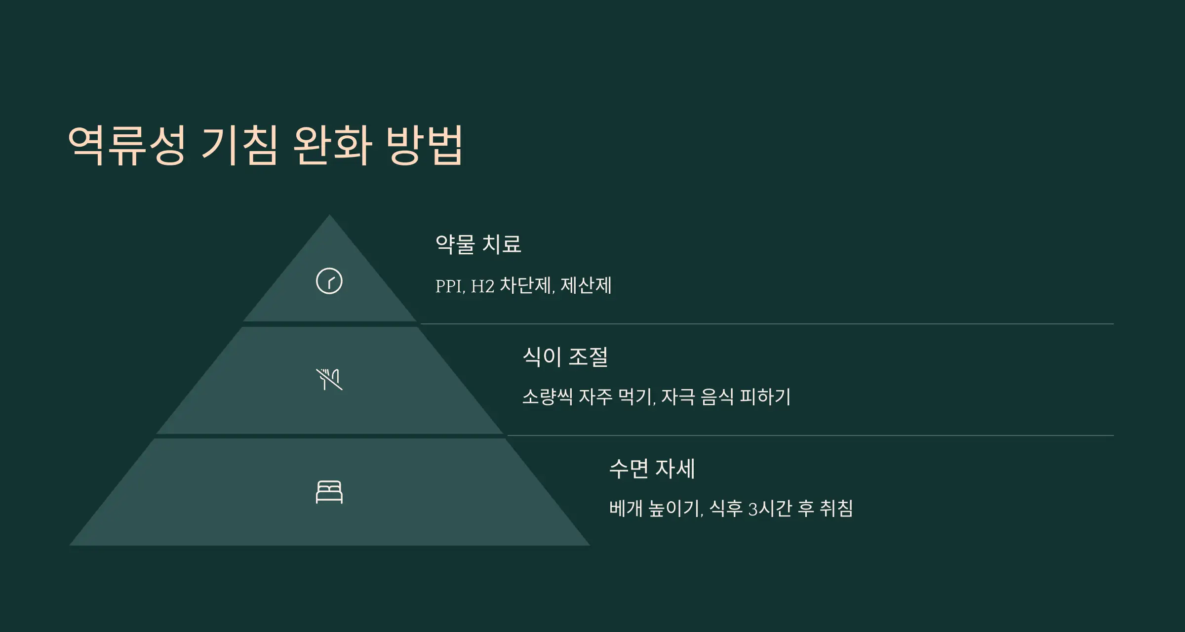 생활 습관 개선과 함께 증상이 나아지는지 확인하고, 심한 경우에는 위산 억제제 치료를 고려해야 해요.