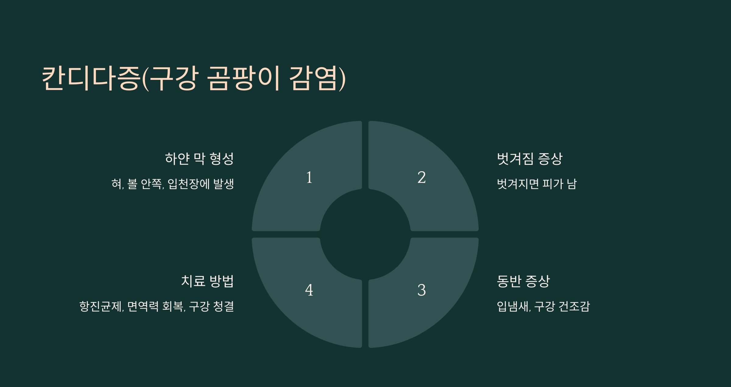 주로 면역력이 약해졌을 때 발생하며, 치료 없이 방치하면 구강 전체로 번질 수 있어요.