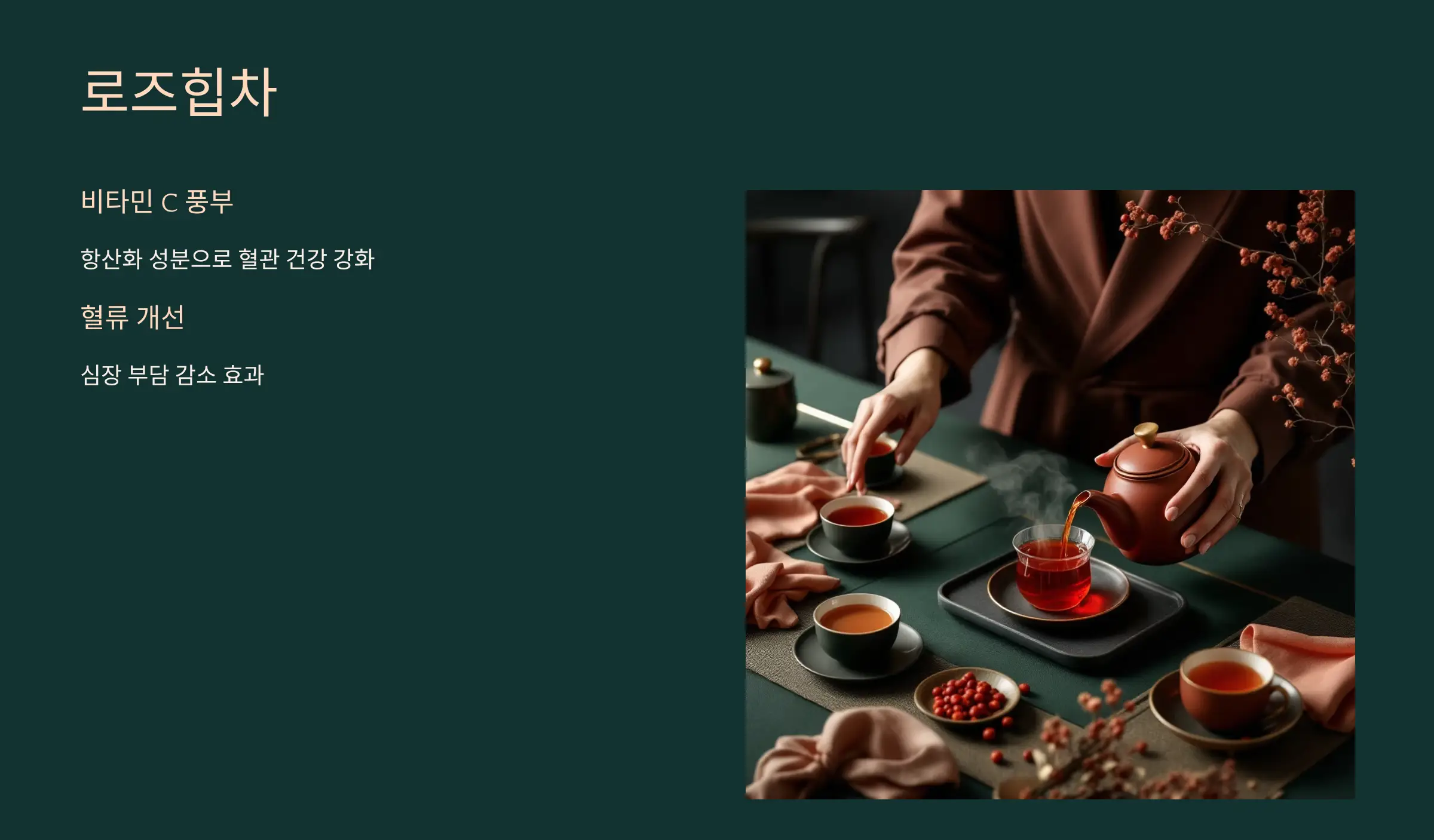 비타민 C와 항산화 성분이 풍부한 로즈힙차는 혈관 건강을 강화합니다. 🌹 혈류 개선 효과로 심장 부담을 줄이는 데 도움을 줍니다.