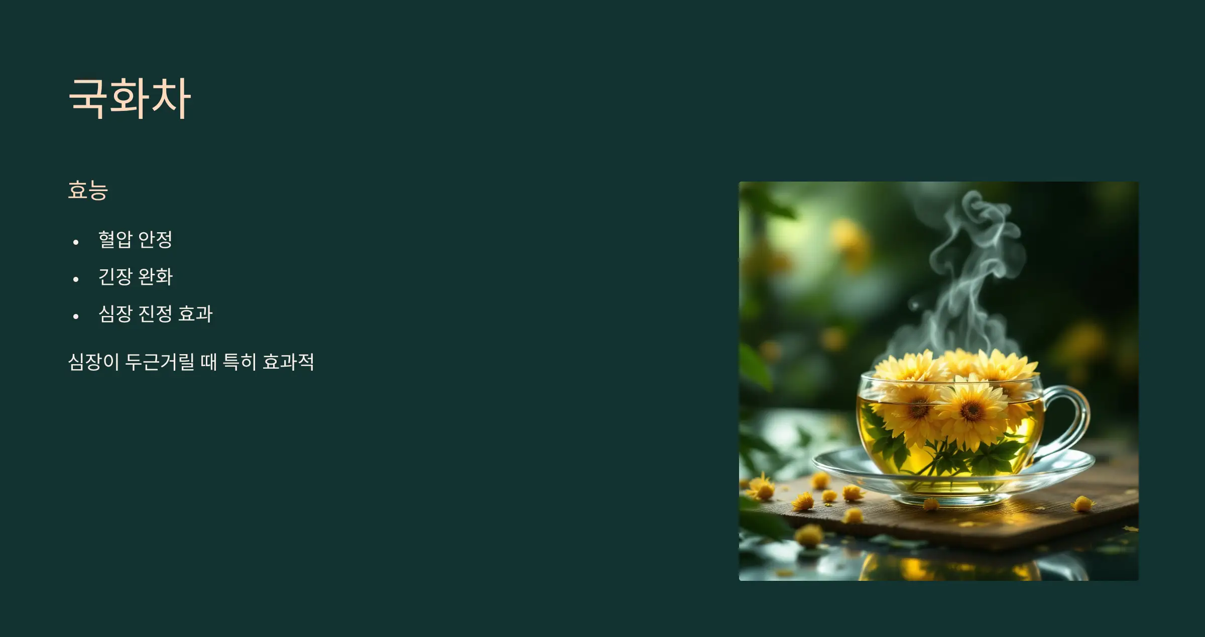 국화차는 혈압 안정과 긴장 완화에 도움을 줍니다. 🌼 특히 심장이 두근거릴 때 진정 효과를 줄 수 있어 부정맥 환자에게 적합한 차 중 하나입니다.