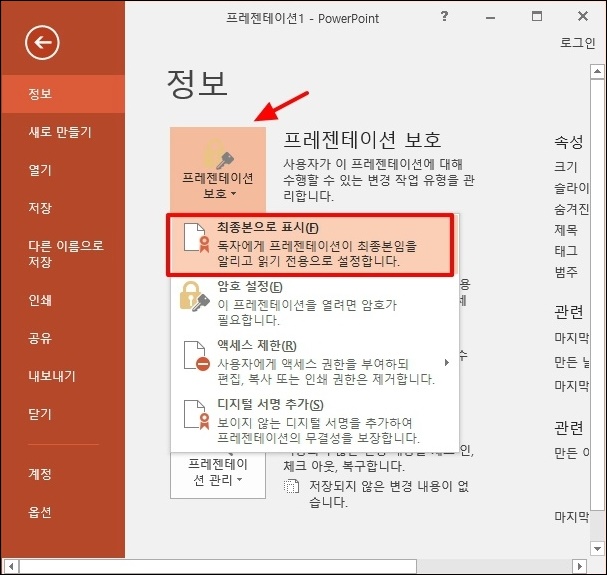 프레젠테이션 읽기 전용은 최종 사본으로 설정하여 수정하거나 암호를 설정할 수 없도록하는 것입니다.