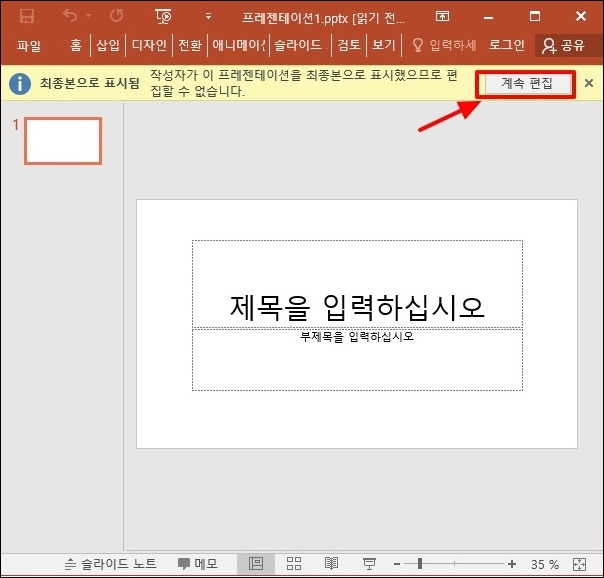 PPT를 실행 한 후 상단의 "계속 편집"버튼을 클릭하여 취소합니다.