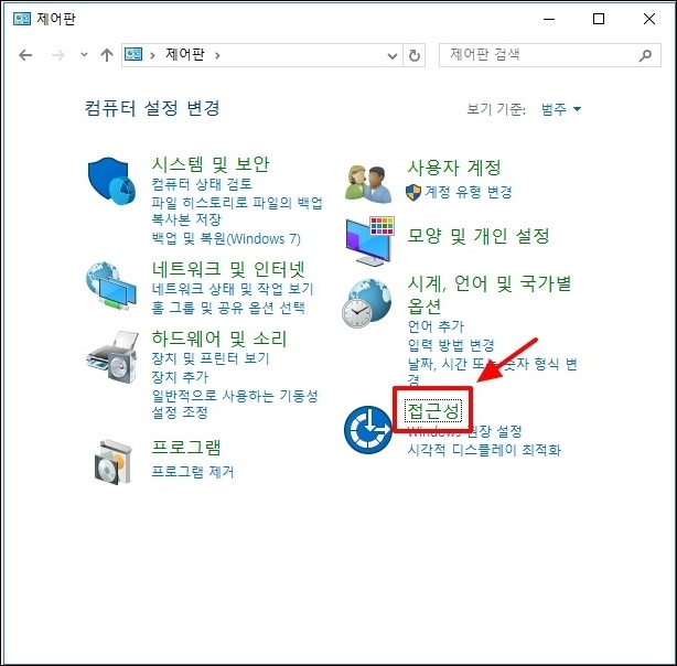 보기 기준이 "범주"로 변경되면 아래쪽 화살표 키 또는 Tab 키를 눌러 "접근성"에 배치 한 다음 Enter 키를 누릅니다.