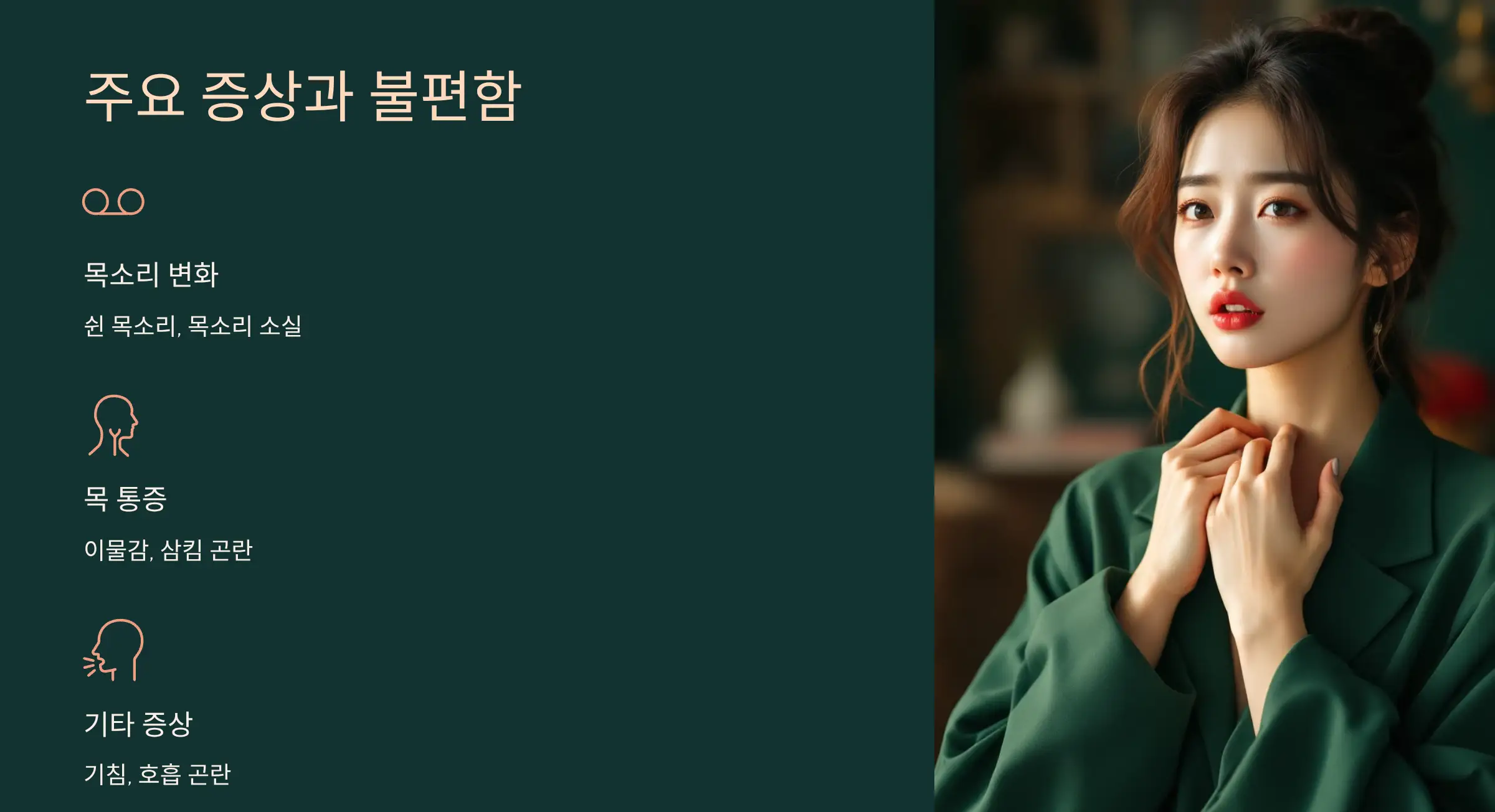 후두염의 대표 증상은 목소리 변화(쉰 목소리, 목소리 소실), 목 통증, 이물감입니다. 심한 경우 호흡 곤란이나 기침이 동반되며, 소아는 밤에 갑자기 심한 기침과 호흡 곤란을 보일 수 있습니다. 목을 자극하는 행동이나 음식은 증상을 악화시킬 수 있기 때문에 관리가 필요합니다.