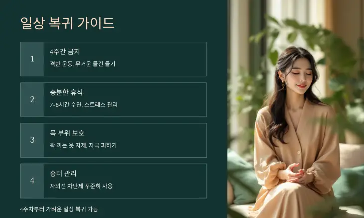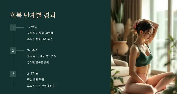 📆 대부분 수술 후 4주차부터는 가벼운 일상 복귀가 가능하지만, 완전한 체력 회복에는 2~3개월이 필요합니다.