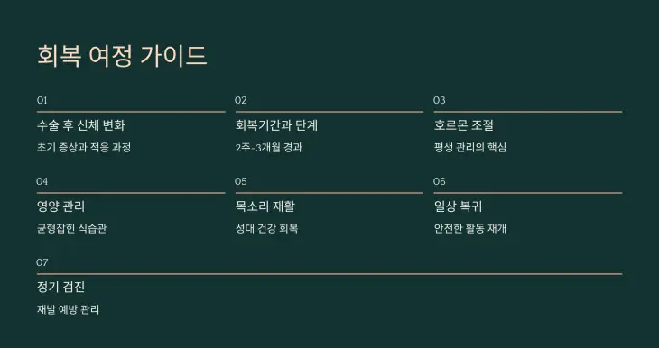💡 회복 속도는 수술 범위(전절제 vs 부분절제), 개인의 체력, 동반 질환 유무 등에 따라 다를 수 있습니다.