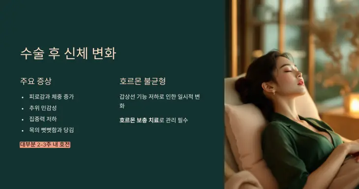 이는 정상적인 회복 과정으로, 대부분 2~3주 내에 호전되지만, 호르몬 보충 치료를 병행하지 않으면 장기적으로 피로감이 지속될 수 있습니다. 따라서 초기 회복단계에서 전문의의 지시를 충실히 따르는 것이 중요합니다.