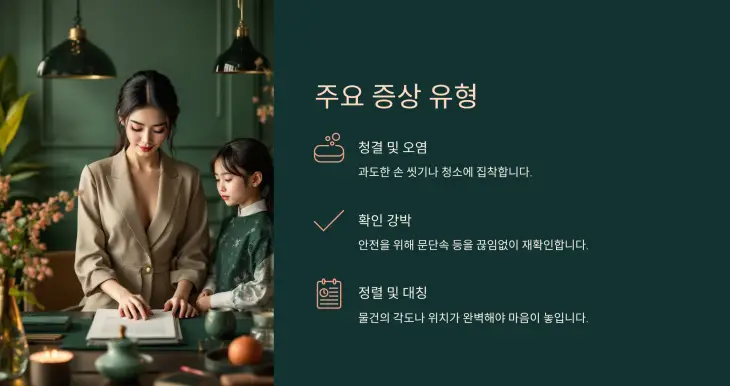 - 청결 및 오염 관련 강박: 손 씻기, 청소 반복