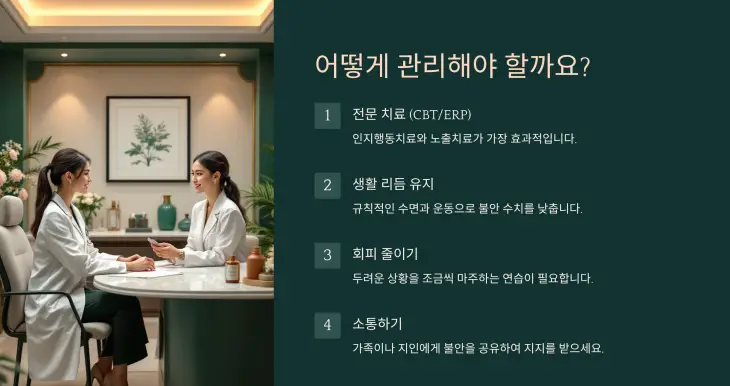 불안을 일으키는 상황을 조금씩 마주하는 연습이 도움이 됩니다.