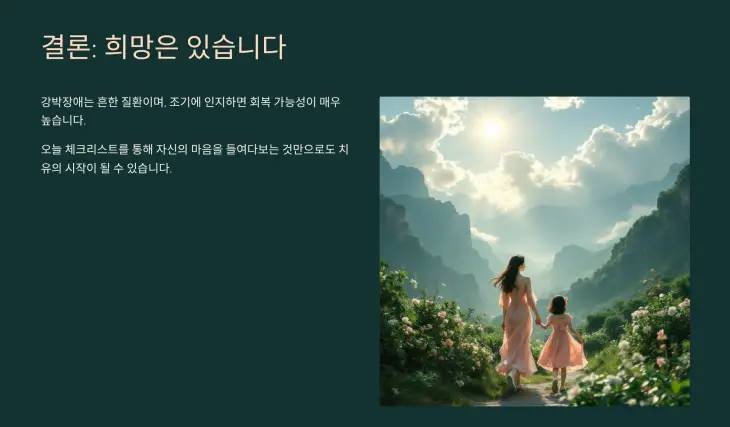 강박장애는 누구에게나 나타날 수 있는 흔한 정신 건강 문제지만, 조기에 인지하면 충분히 회복 가능성이 높아요.