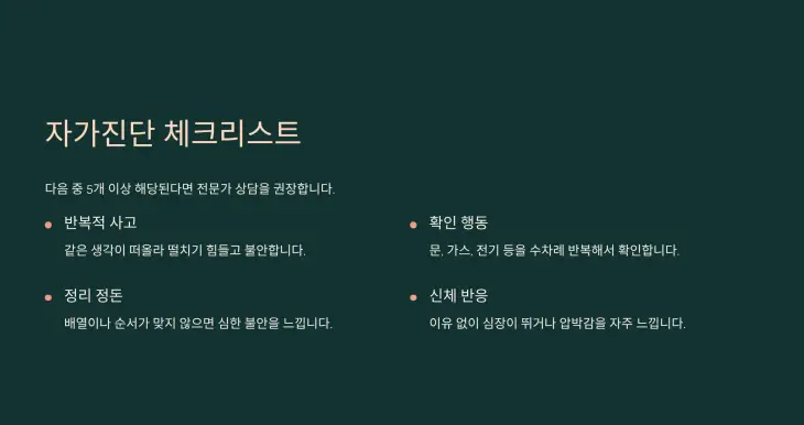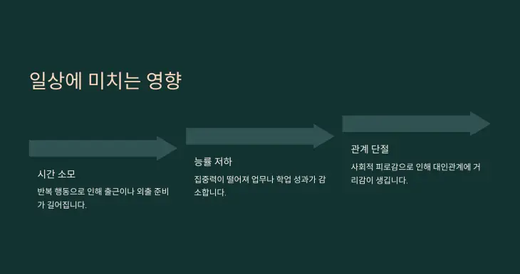 이렇듯 ‘머릿속의 불안 → 행동 반복 → 마음의 압박감 증가’라는 악순환이 이어질 수 있어요.