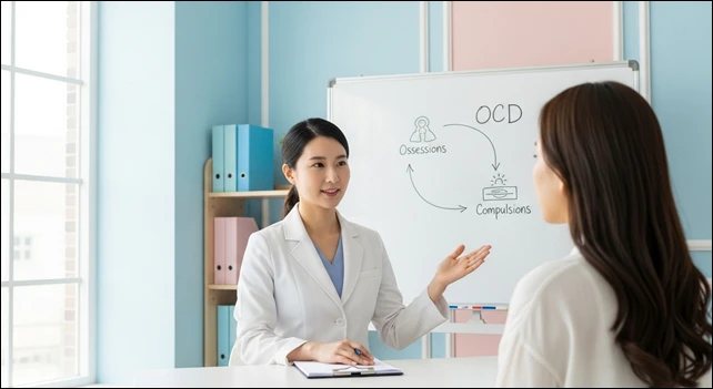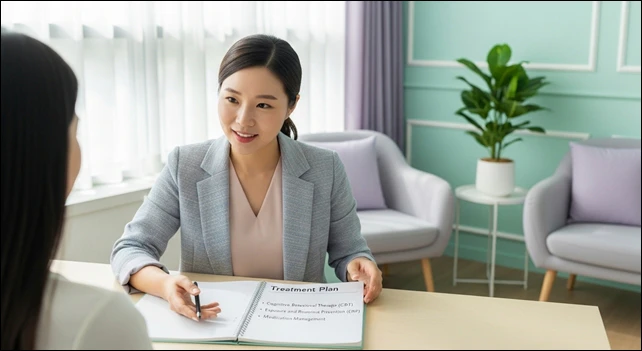 강박장애 치료 방법(CBT, ERP, 약물치료)을 설명하는 한국인 치료 상담 장면