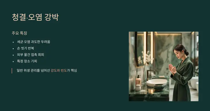 청결 강박은 세균이나 오염에 대한 과도한 두려움으로 인해 손 씻기, 세정, 소독 행동을 반복하는 유형입니다. 외부 물건을 만지는 것을 피하거나, 특정 장소에 가는 것 자체를 꺼리는 모습으로도 나타납니다.