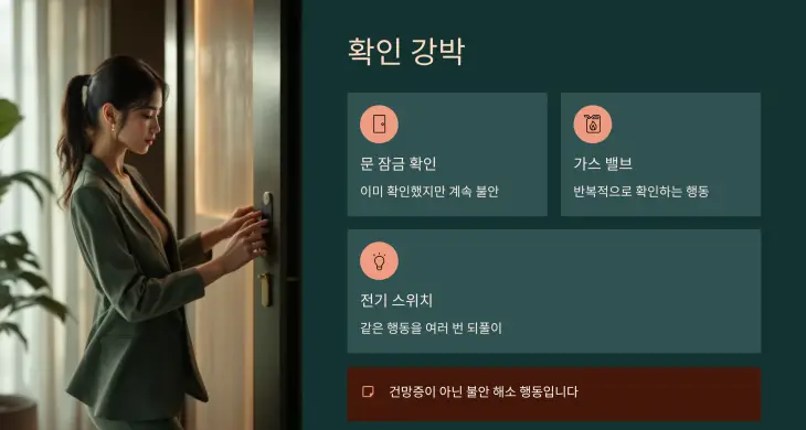 이 유형은 건망증이나 주의력 문제로 오해받기 쉽지만, 실제로는 기억의 문제가 아니라 불안을 해소하기 위한 행동이라는 점이 핵심입니다. 확인 행위 자체가 일시적으로 안정을 주기 때문에 반복이 강화되는 구조를 갖고 있습니다.
