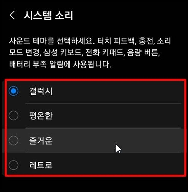 - 기본적으로 "갤럭시" 소리가 설정되어 있으며, 원하는 소리를 선택하여 변경할 수 있습니다.