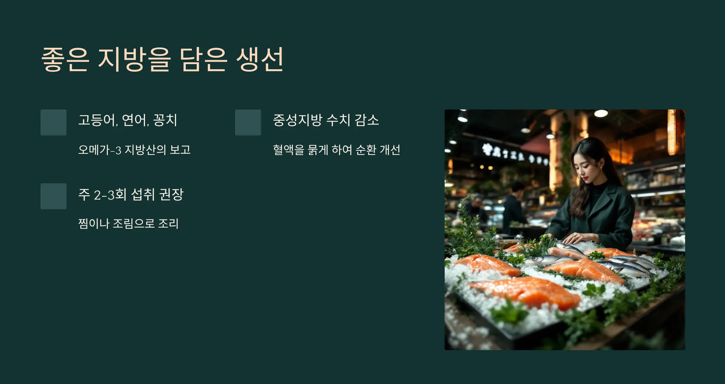 고등어, 연어, 꽁치 같은 생선은 오메가-3 지방산의 대표적인 공급원입니다. 🐟 오메가-3는 중성지방 수치를 낮추고, 혈액을 묽게 하여 혈액순환을 원활하게 돕습니다. 전문가들은 주 2~3회 이상 생선을 섭취할 것을 권장하며, 특히 구이보다는 찜이나 조림 등 기름 사용이 적은 조리법이 바람직합니다.
