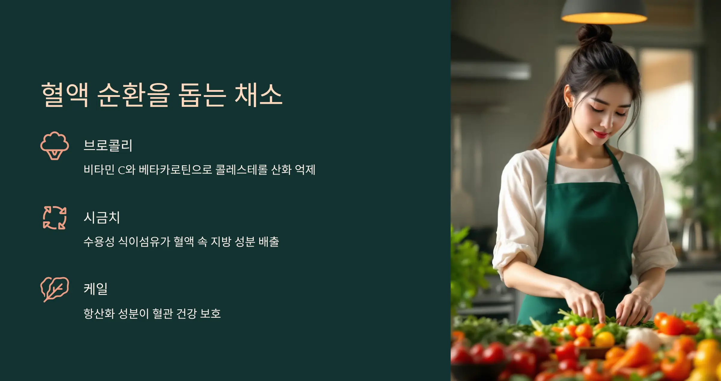 녹색 채소는 혈관을 건강하게 지키는 데 매우 효과적입니다. 브로콜리, 시금치, 케일에는 비타민 C와 베타카로틴 같은 항산화 성분이 풍부하여 콜레스테롤 산화를 억제합니다. 🥦 또한 수용성 식이섬유가 혈액 속 지방 성분을 흡착해 배출시키는 데 도움을 줍니다. 다양한 색깔의 채소를 섭취하는 것은 혈액 순환을 원활하게 하는 중요한 생활 습관입니다.