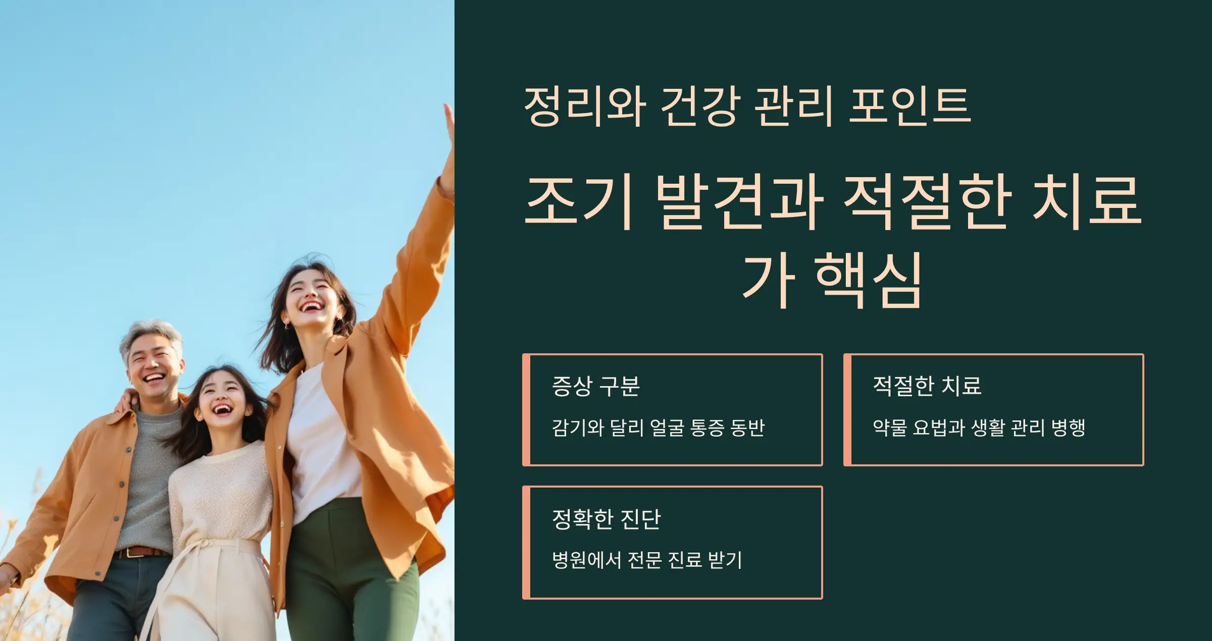 조기에 증상을 구분하고, 적절한 치료와 생활 관리로 회복을 앞당기는 것이 중요합니다. 감기와 구분이 어렵다면 병원에서 정확한 진단을 받아보는 것이 가장 확실한 방법입니다.
