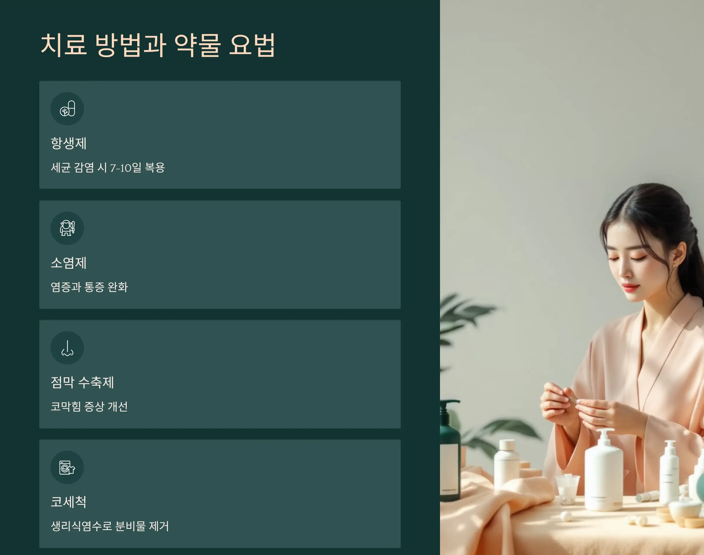 급성 비부비동염의 치료는 항생제, 소염제, 점막 수축제 등 약물 요법이 중심이 됩니다. 세균 감염이 의심될 경우 항생제를 7~10일 정도 사용하며, 비충혈 제거제와 진통제를 병행해 증상을 완화합니다.