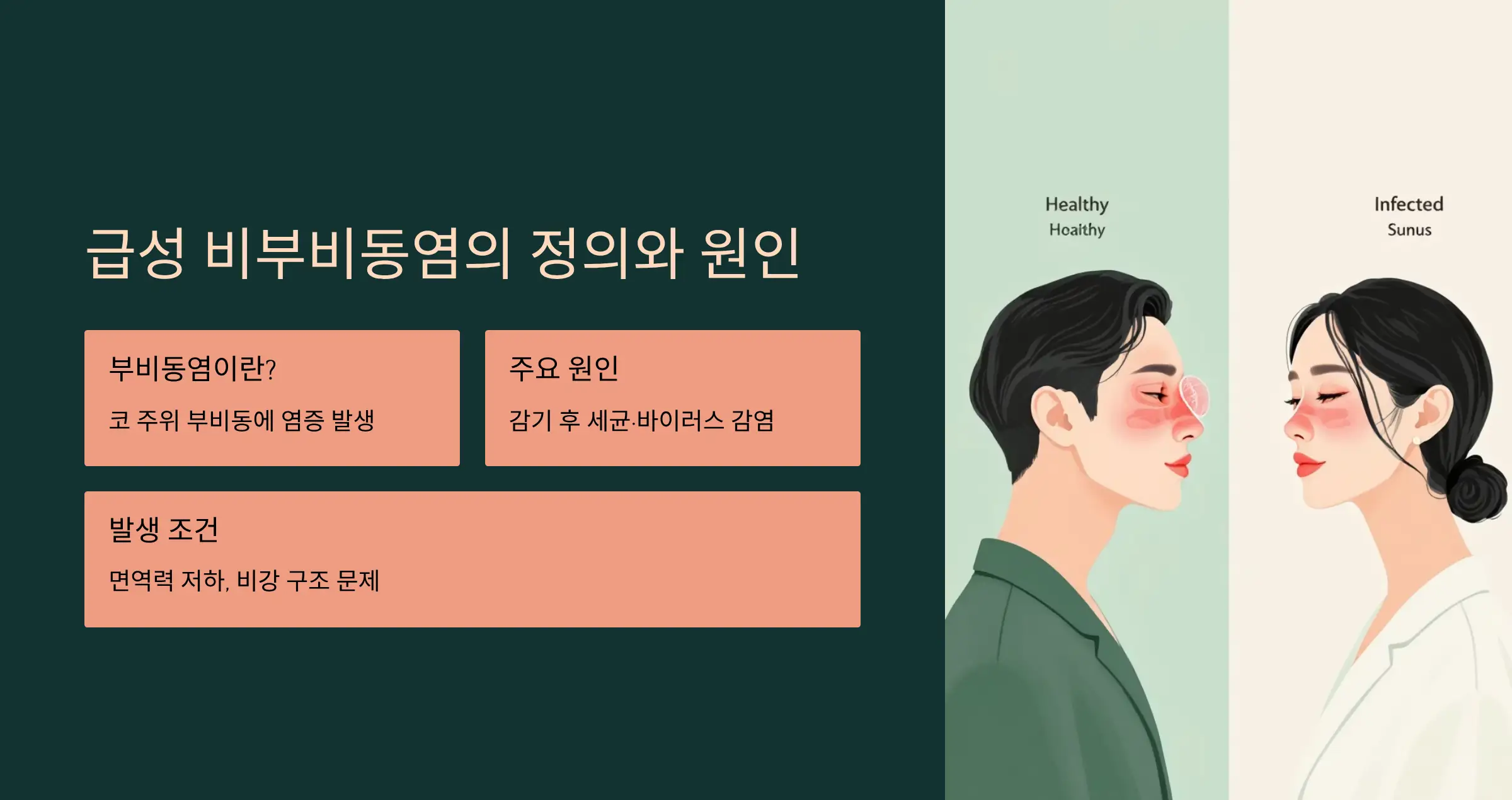 급성 비부비동염은 흔하지만 제대로 관리하지 않으면 일상생활의 불편뿐 아니라 합병증으로 이어질 수 있습니다.