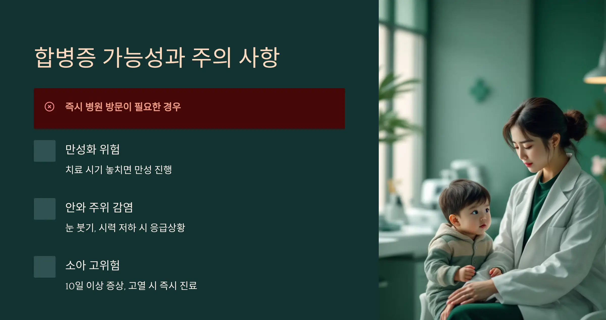 치료 시기를 놓치면 급성에서 만성으로 진행할 수 있고, 드물게는 안와 주위 감염이나 뇌막염 같은 합병증이 생길 수 있습니다. 눈이 붓거나 시력이 저하되는 경우 즉시 의료기관을 방문해야 합니다.