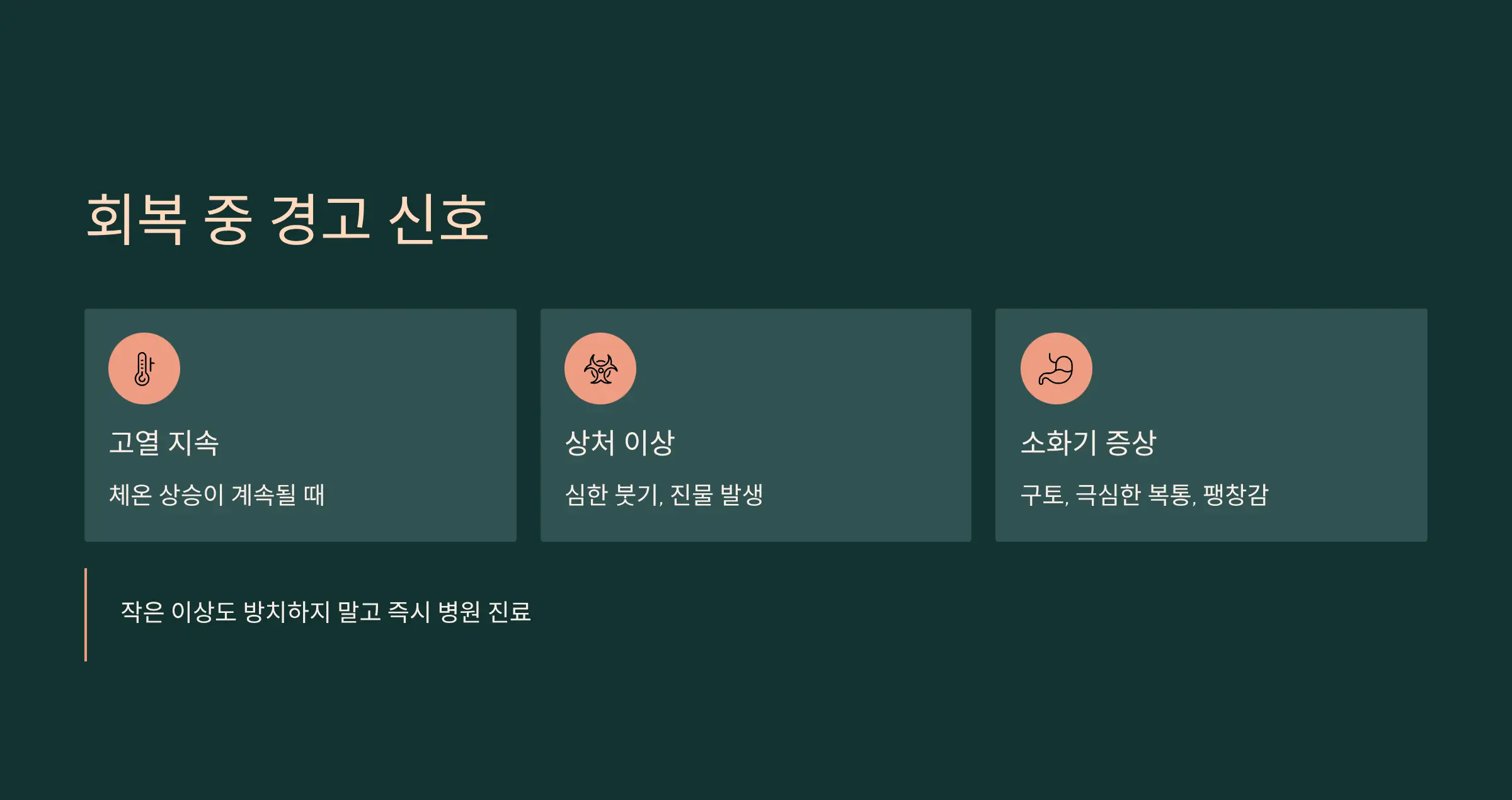 이런 증상들은 합병증을 알리는 신호일 수 있으니 즉시 병원 진료를 받아야 합니다. 🙏 작은 이상도 방치하지 말고 빠르게 대응하는 것이 회복을 앞당기는 방법입니다.