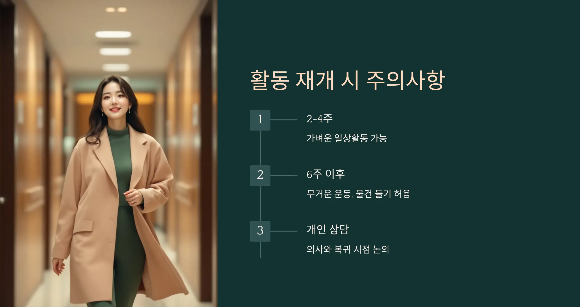 회복 기간 중 가장 많이 하는 질문이 “언제부터 일상생활이 가능할까?”예요. 일반적으로는 2~4주 정도 지나면 가벼운 활동이 가능하지만, 무거운 물건 들기, 격한 운동은 최소 6주 이후가 안전합니다. 🚶♀️ 무리하게 활동을 시작하면 수술 부위가 벌어질 수 있으니 꼭 주의해야 해요. 특히 학생이나 직장인은 복귀 시점에 대해 의사와 상담해 개인 상황에 맞는 조언을 받는 게 가장 좋습니다.