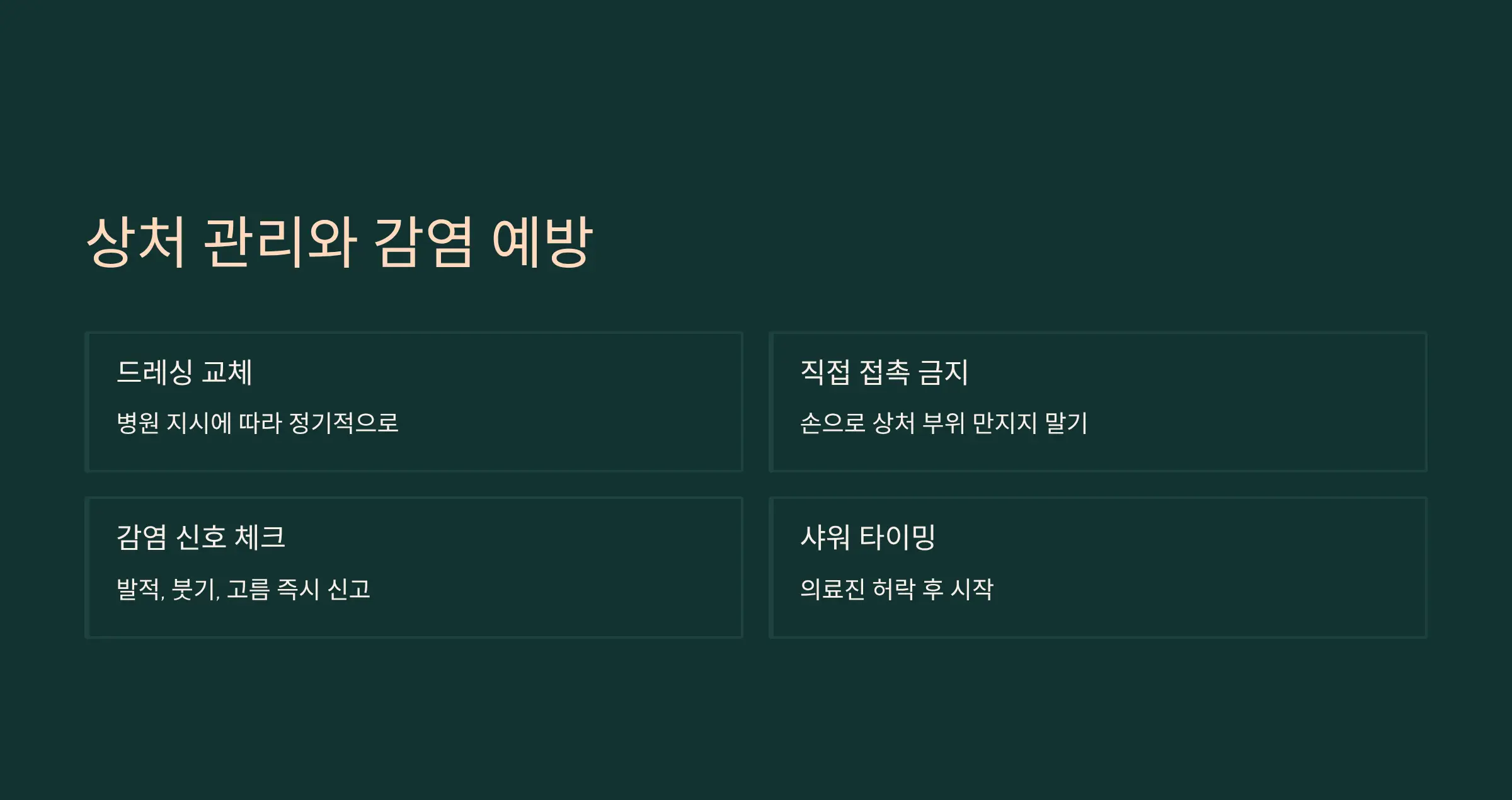 상처 부위는 회복의 핵심이에요. 드레싱은 병원 지시에 맞게 갈아주고, 손으로 직접 만지지 않도록 주의하세요. 🚫 발적, 붓기, 고름 같은 이상 증상이 보이면 감염 신호일 수 있으니 즉시 병원에 알려야 합니다. 또한 샤워는 상처가 어느 정도 아물고 의료진이 허락한 뒤부터 해야 해요. 상처 관리에 소홀하면 흉터가 커지거나 합병증이 생길 수 있으니 꾸준히 체크하는 게 필요합니다.
