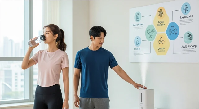 점액이 묽어져 가래 배출이 쉬워집니다. - 실내 습도 유지 (40~60%)