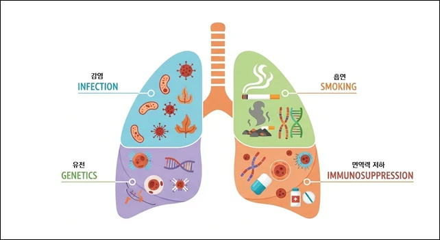 기관지 확장증은 단독 원인보다는 여러 요인이 복합적으로 작용합니다.