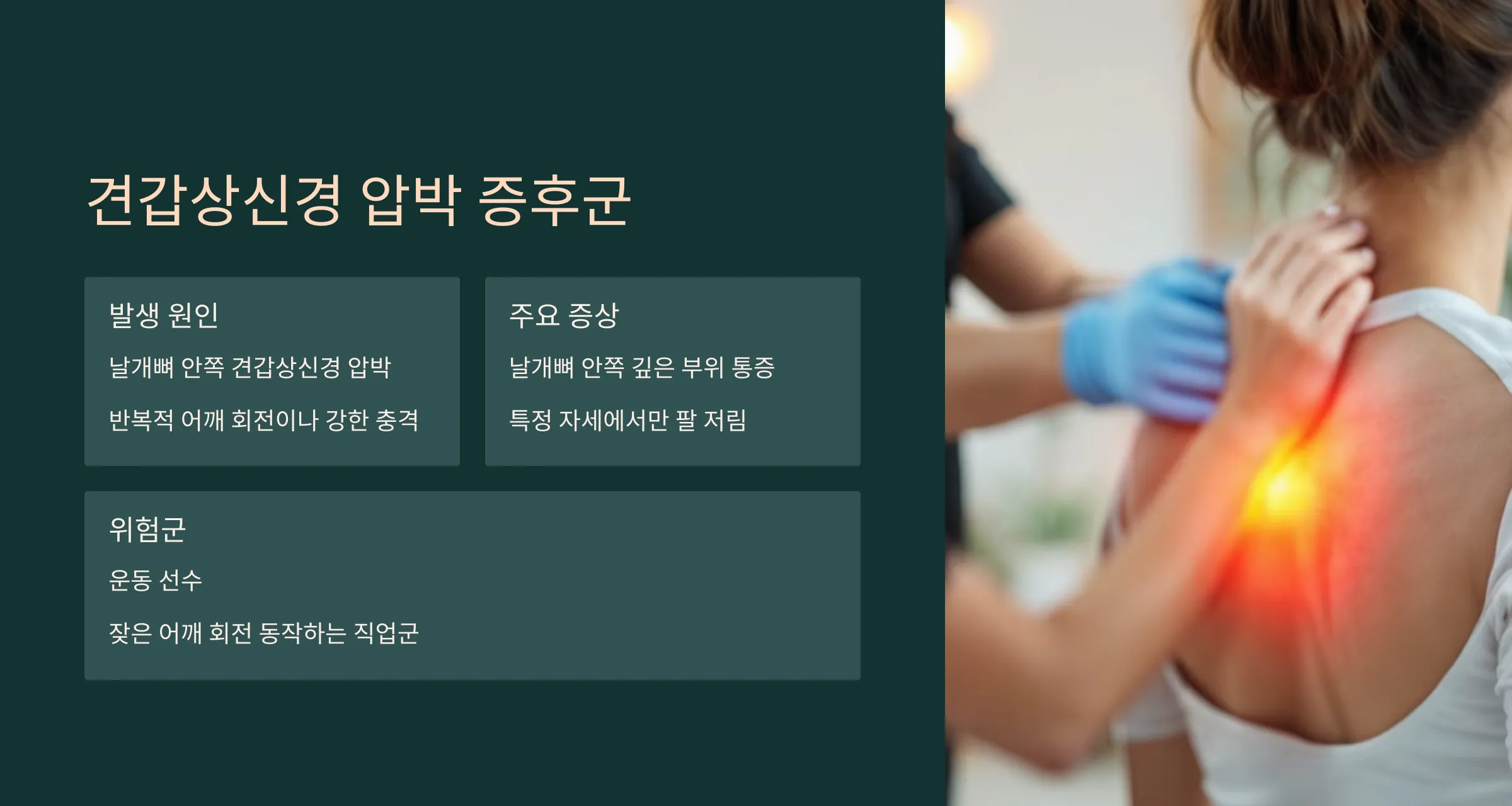 날개뼈 안쪽에 위치한 견갑상신경이 압박되며 발생하는 질환입니다.