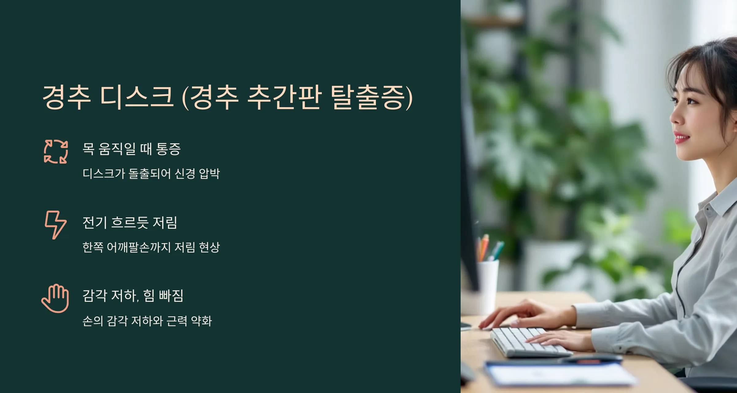 사실 이런 증상은 단순한 자세 문제일 수도 있지만, 신경이나 디스크, 혈류 문제로 인한 병적 징후일 수 있어요.