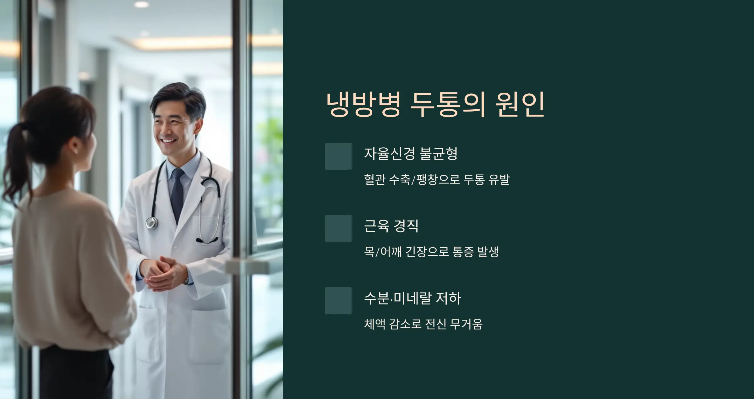 - 냉방병 두통은 자율신경 불균형 + 근육 경직 + 수분 부족 복합 원인이 있어요