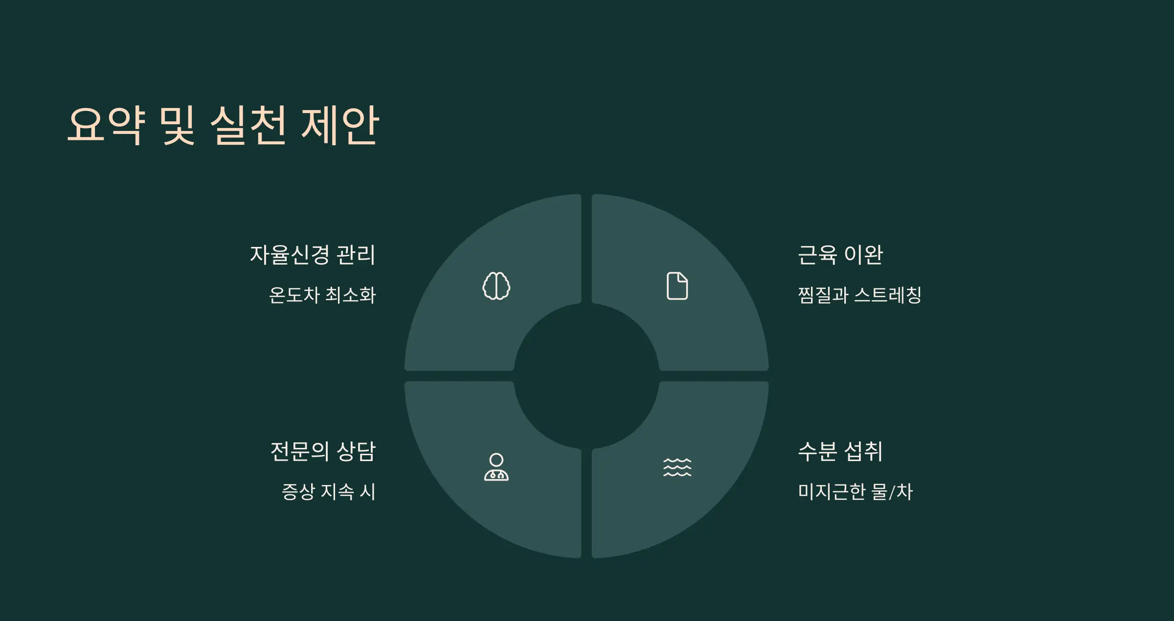 - 온도 조절만으로 부족할 수 있으니 스트레칭, 수분 섭취도 병행해 주셔야 합니다.