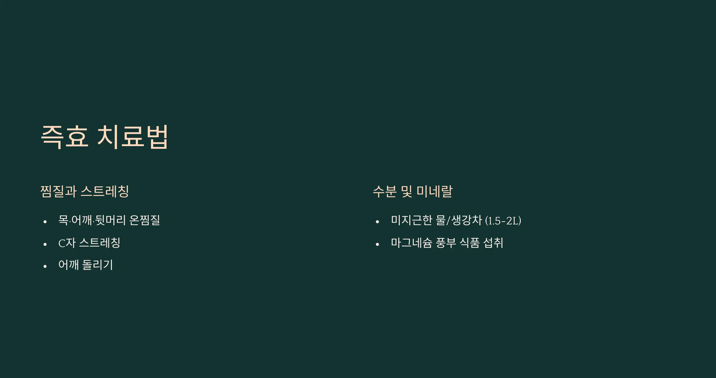 - 즉시 효과적인 방법은 따뜻한 찜질과 스트레칭, 타이레놀 복용입니다