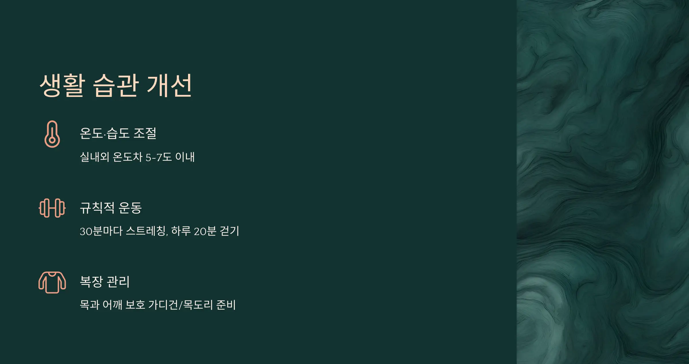 - 근본 치료는 환기, 습도 조절, 옷차림, 운동, 수분 섭취 등 습관 관리가 필수입니다