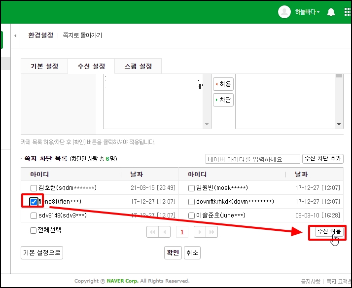 우측 하단에 [수신 허용] 버튼을 클릭하시면 차단 해제 되어 다시 쪽지를 받을 수 있게 됩니다.