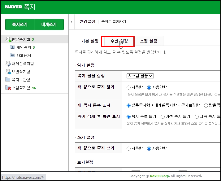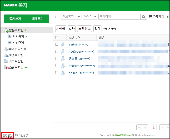 받은 쪽지함으로 이동 후하단 [환경설정]을 클릭해주세요