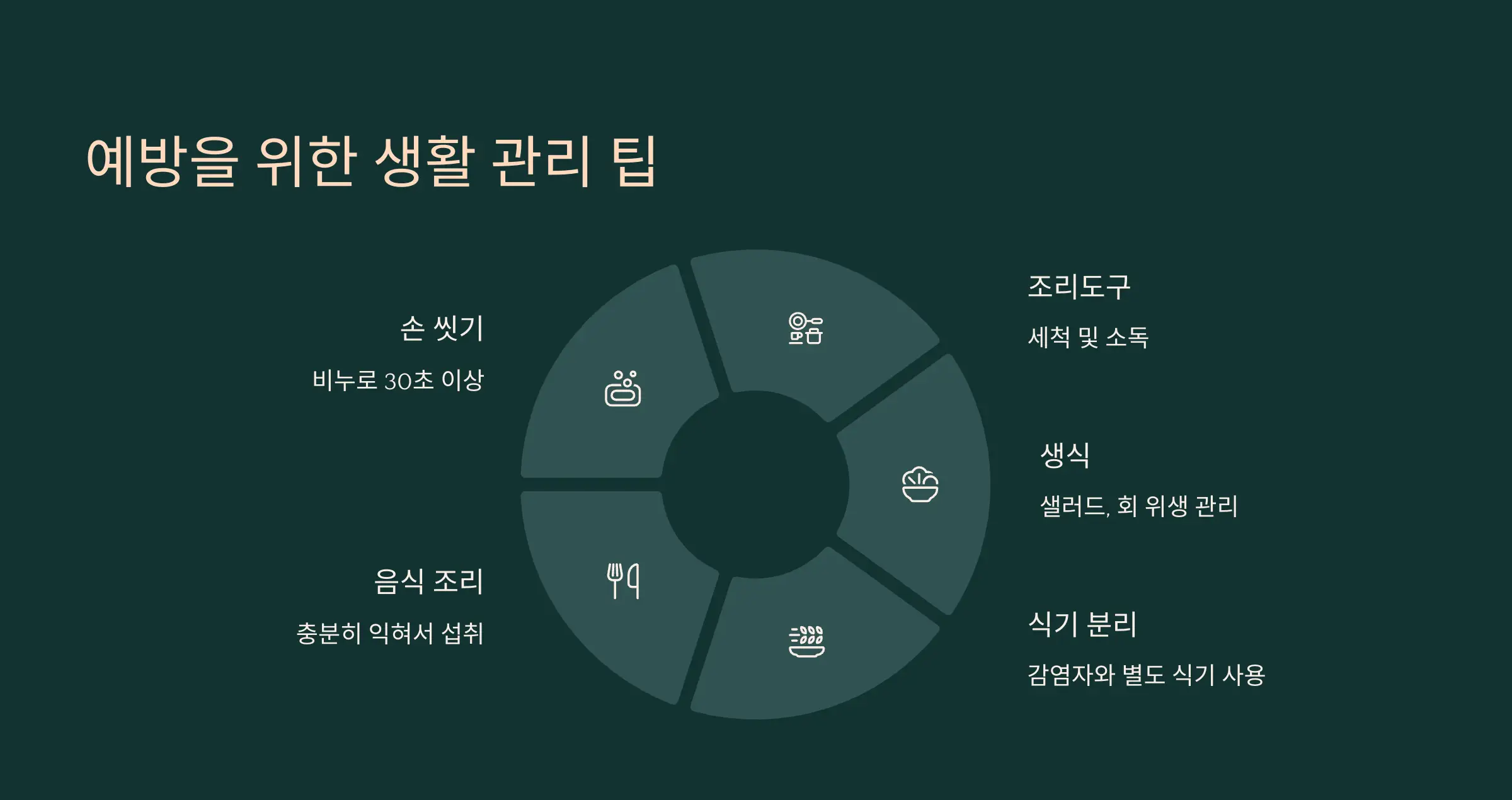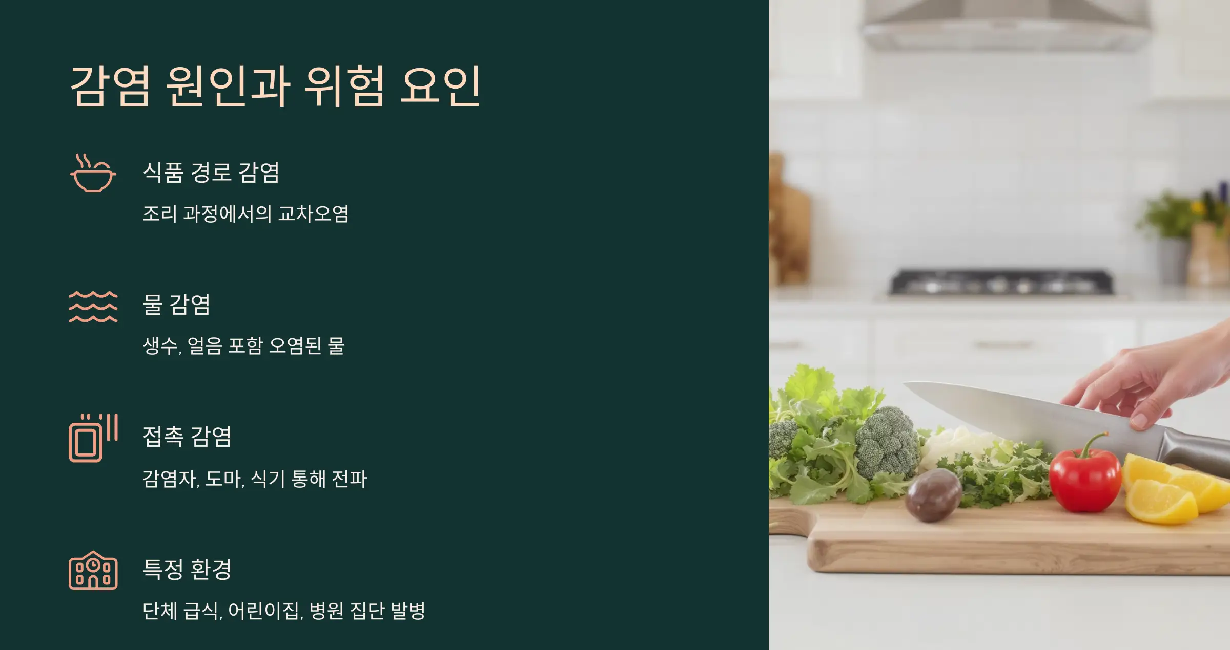 - 접촉 감염: 감염자와의 접촉, 도마·식기 등 통해 퍼질 수 있어요