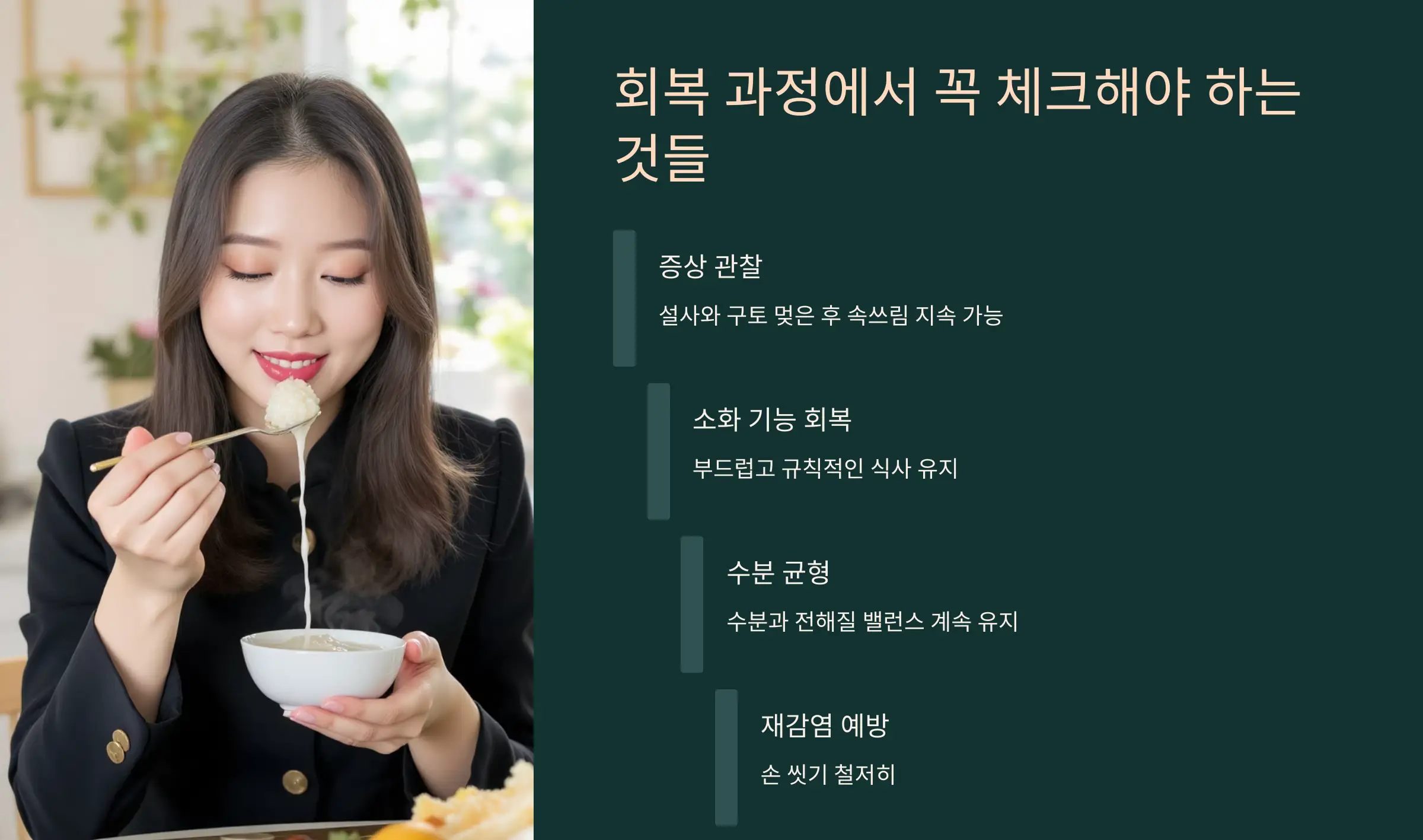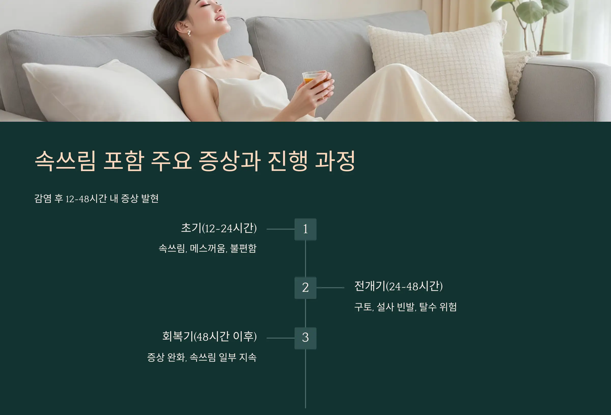 - 회복기(48시간 이후): 증상 완화, 하지만 속쓰림·소화 불량 일부 지속