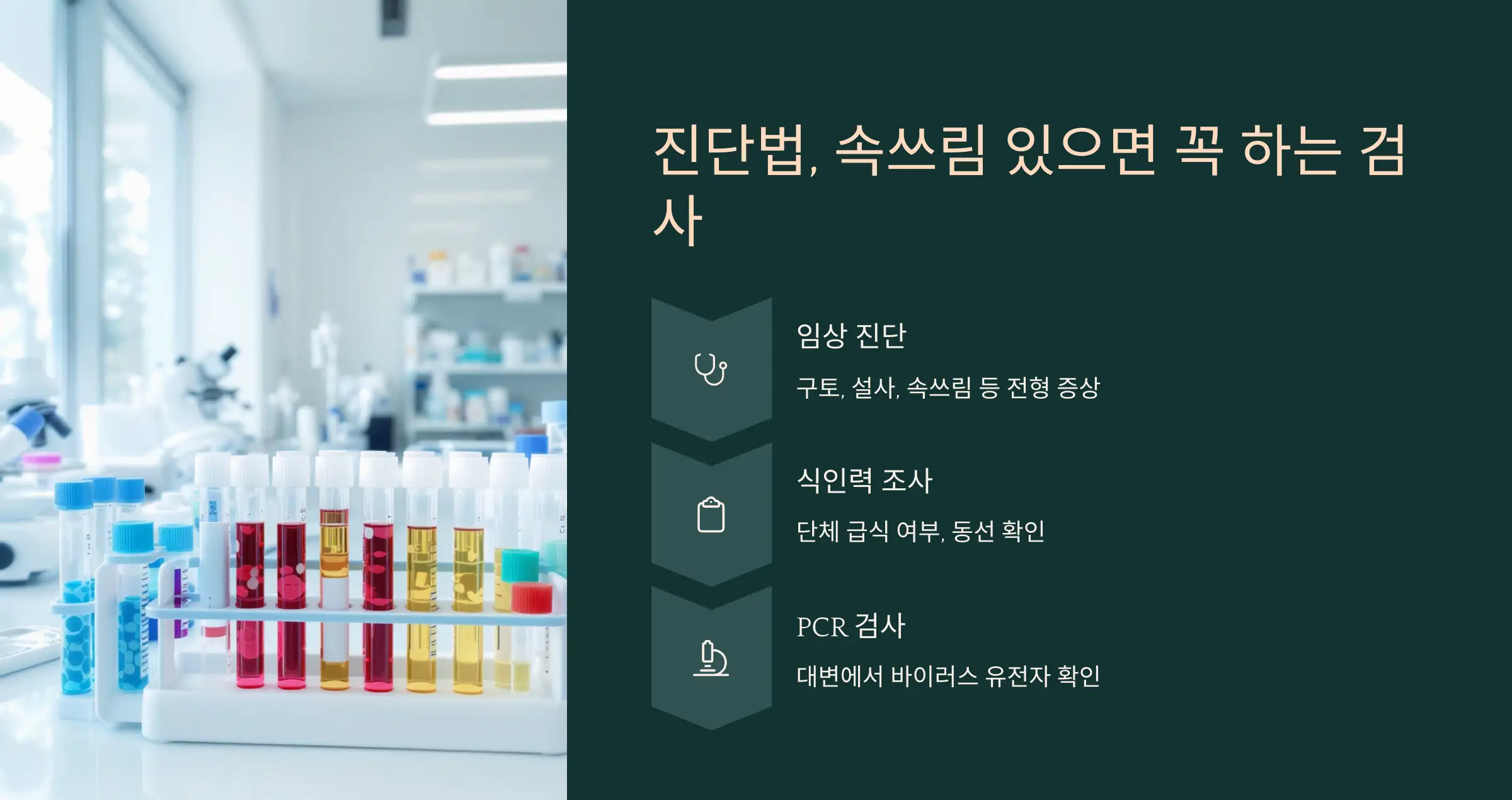 - 분자생물학 검사(PCR): 대변에서 바이러스 유전자 확인