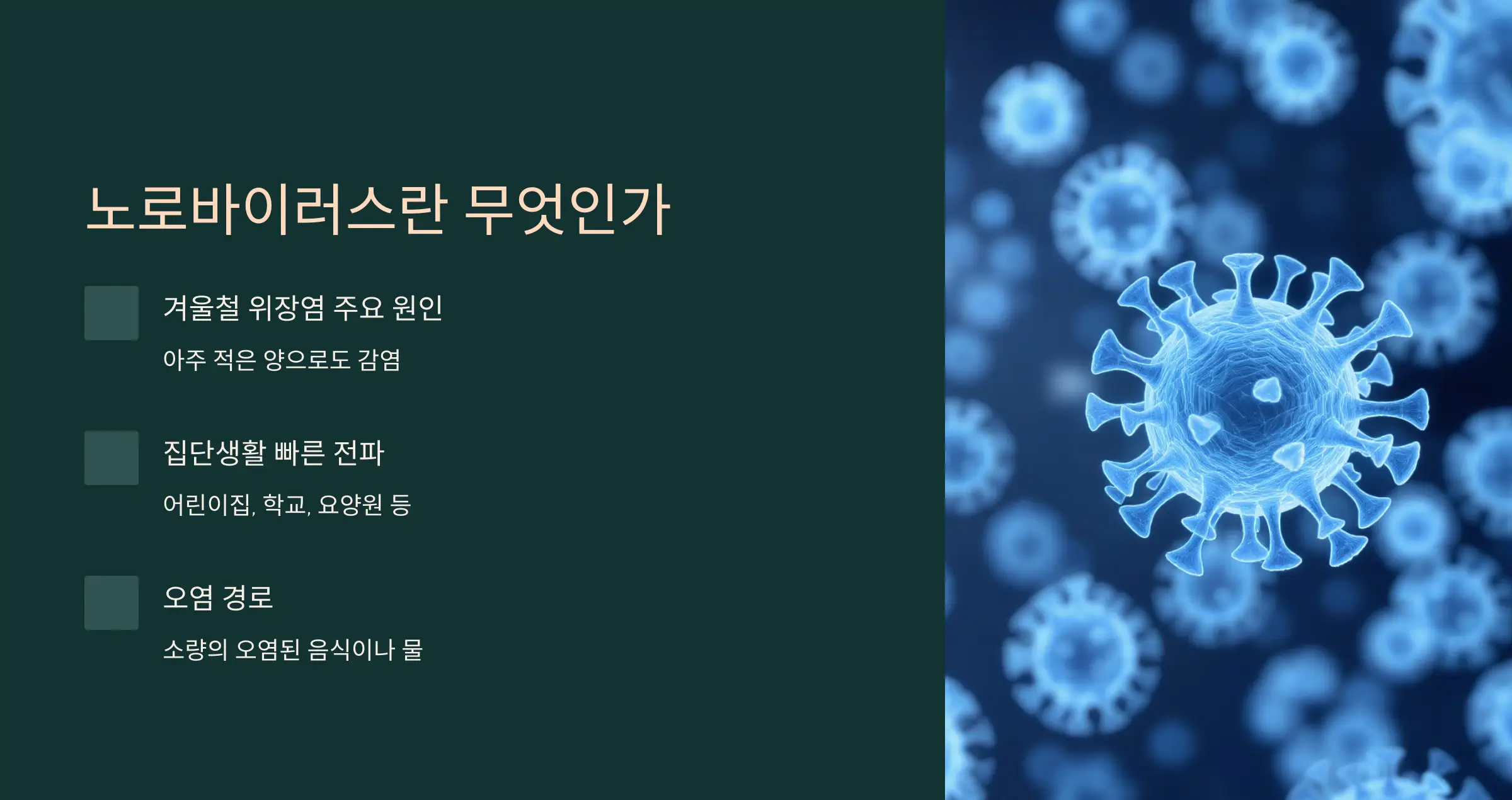 노로바이러스는 전 세계적으로 겨울철 위장염의 주요 원인 중 하나로, 아주 적은 양으로도 감염될 수 있어요.