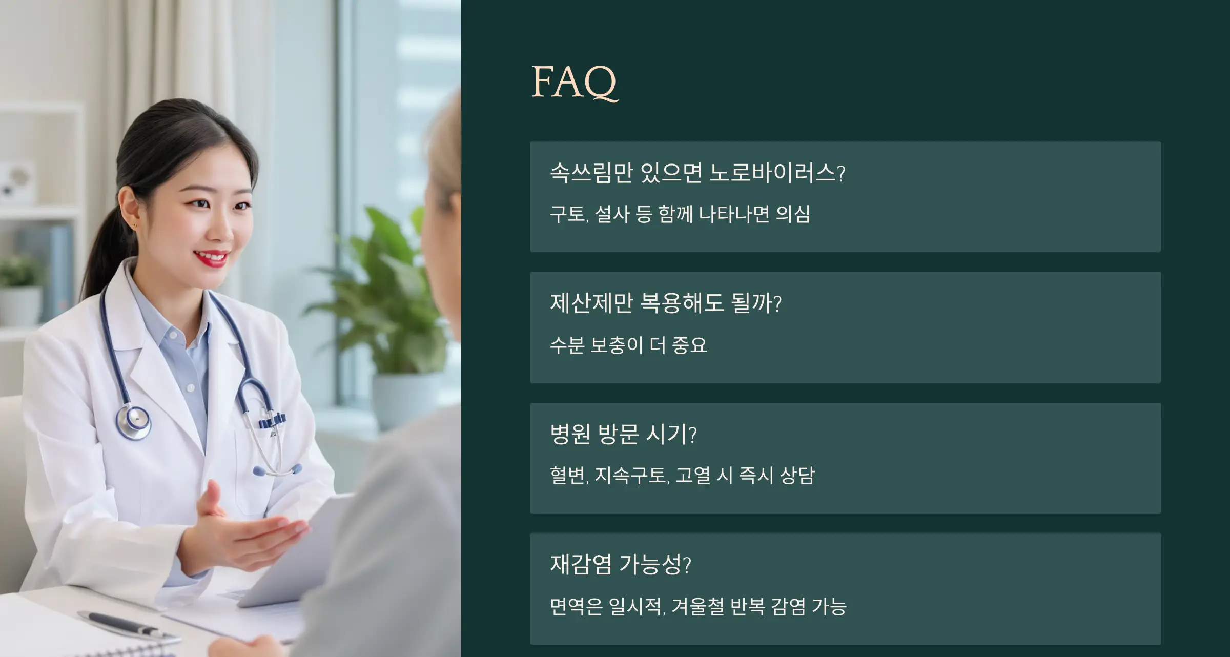 A. 국내에선 아직 국내용 노로바이러스 백신은 없으며, 예방은 위생·위생, 손씻기, 조리 관리가 최선입니다.
