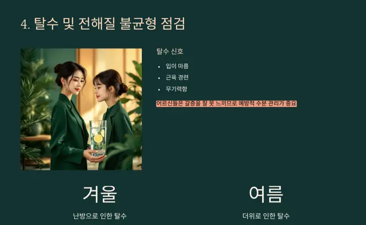 어르신들은 갈증을 잘 못 느끼기 때문에 예방 차원에서도 수분 관리가 매우 중요합니다.