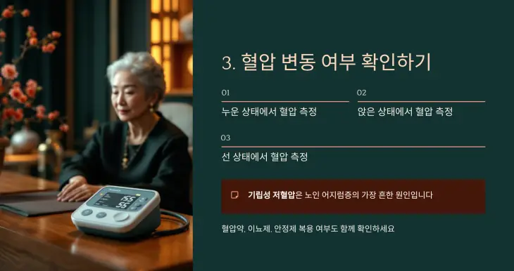 노인 어지럼증의 가장 흔한 원인은 혈압 변화, 특히 ‘기립성 저혈압’이에요. 누워 있다가 일어날 때 혈압이 확 떨어지면 속이 울렁거리고 눈앞이 흐려지는 느낌이 오며 어지럼증이 동반될 수 있죠.