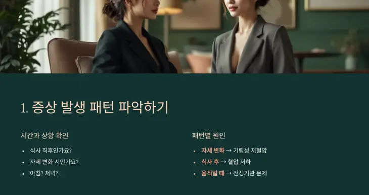 속이 미식거리고 어지럽다는 증상은 나타난 시간과 상황을 확인하는 것이 우선이에요. 식사 직후인지, 앉았다가 일어날 때인지, 아침인지 저녁인지에 따라 원인 방향이 크게 달라집니다.
