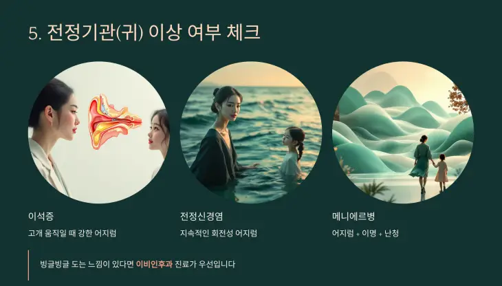 빙글빙글 도는 느낌, 머리 돌릴 때 어지럼, 미식거림이 있다면 귀의 전정기관 문제를 우선적으로 확인해야 합니다.
