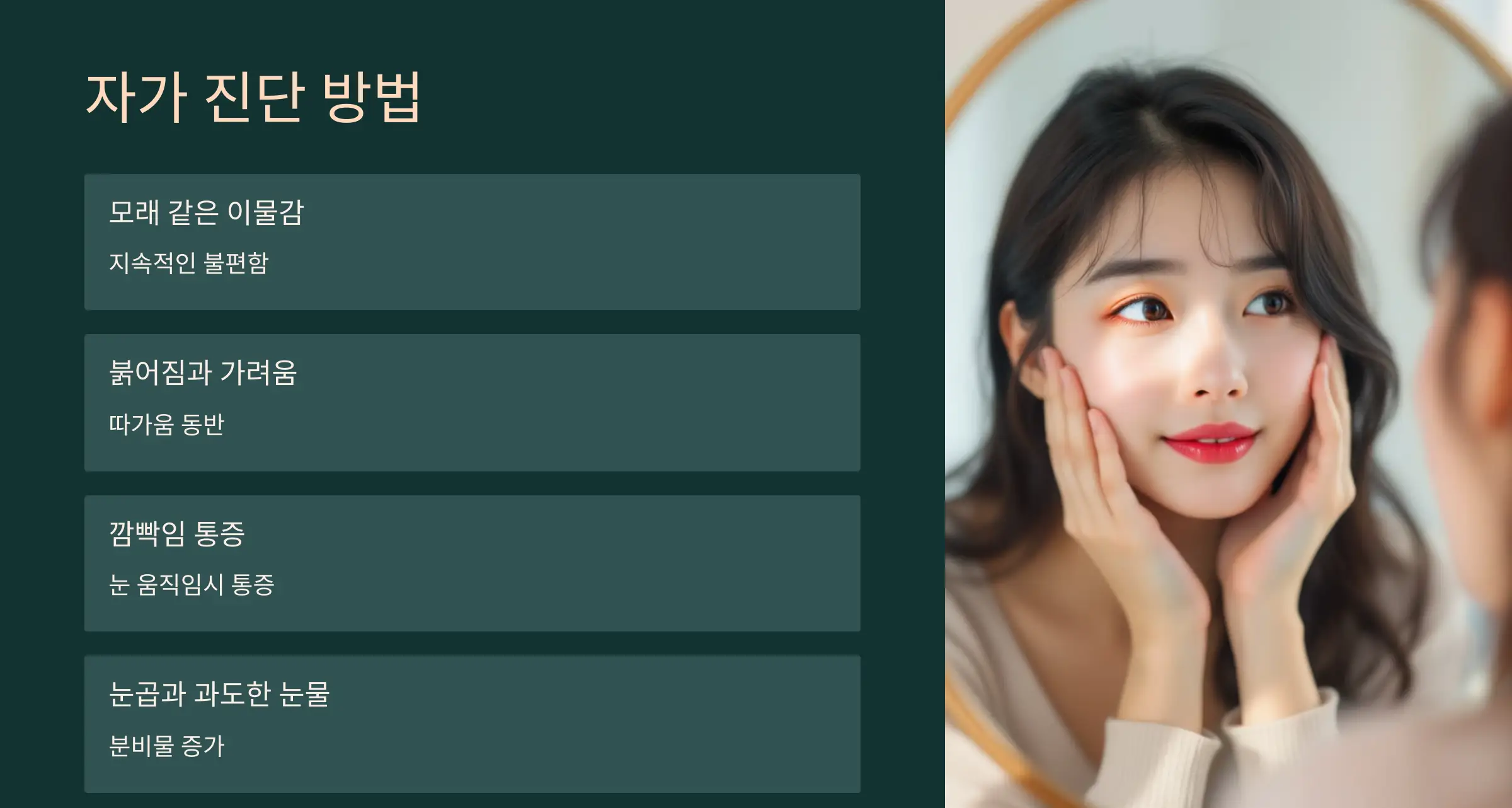 - 안과 방문: 증상이 지속되거나 악화되면 전문의의 진료를 받습니다.