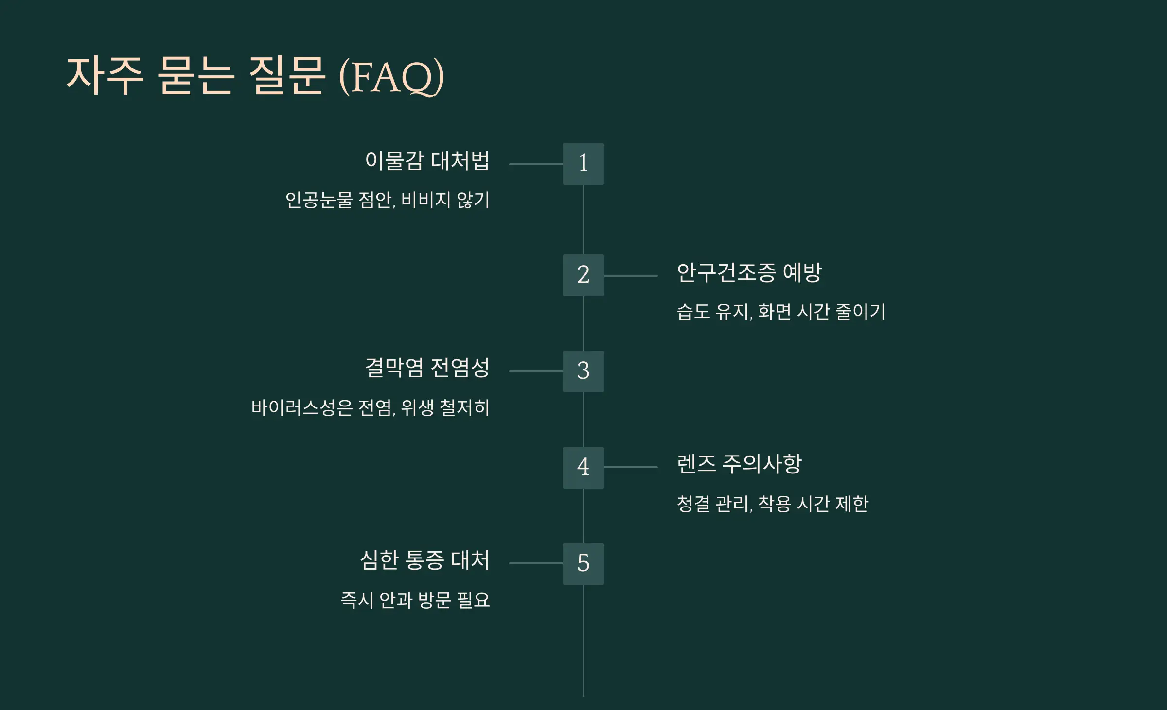 눈에 이물감, 통증, 간지러움이 느껴질 때 이를 가볍게 여기지 말고 원인을 파악하여 적절한 치료를 받는 것이 중요합니다. 일상에서의 작은 습관 변화로도 눈 건강을 지킬 수 있으니, 위에서 소개한 방법들을 실천해보세요. 😊
